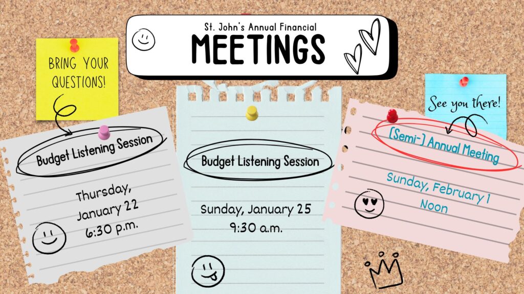 All voting members of St. John’s are encouraged to attend the (semi-)annual meeting. The primary focus of this meeting is approval of the proposed budget and election of the nominating committee.